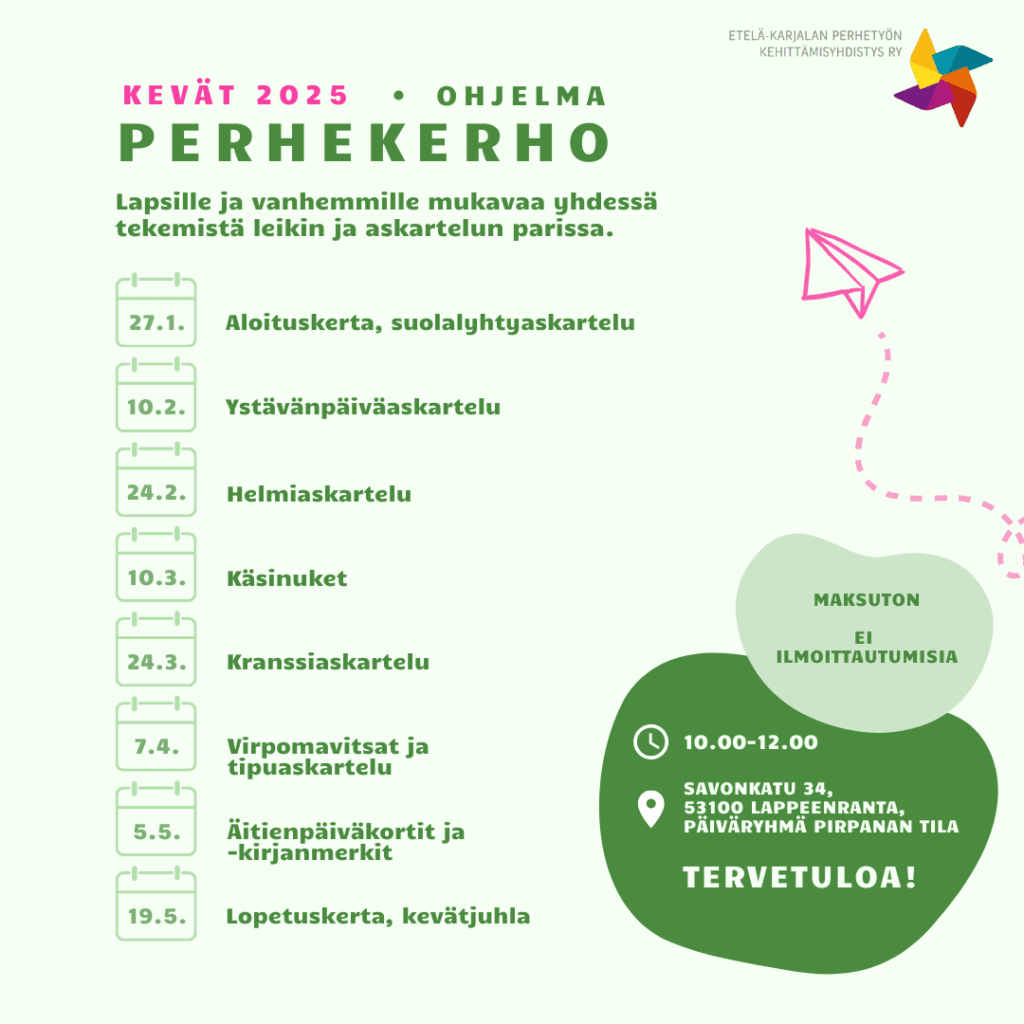 Perhekerho kokoontuu kevät- ja syyskaudella vauvaperheryhmä Pirpanan tiloissa.