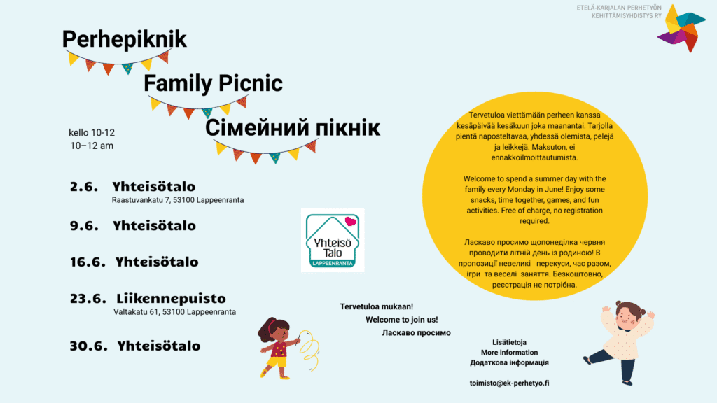 Tarjolla pientä naposteltavaa, yhdessä olemista, pelejä ja leikkejä. Maksuton, ei ennakkoilmoittautumista. Perhepiknik järjestetään Yhteisötalon sisäpihalla, poislukien 23.6. jolloin olemme Liikennepuistossa