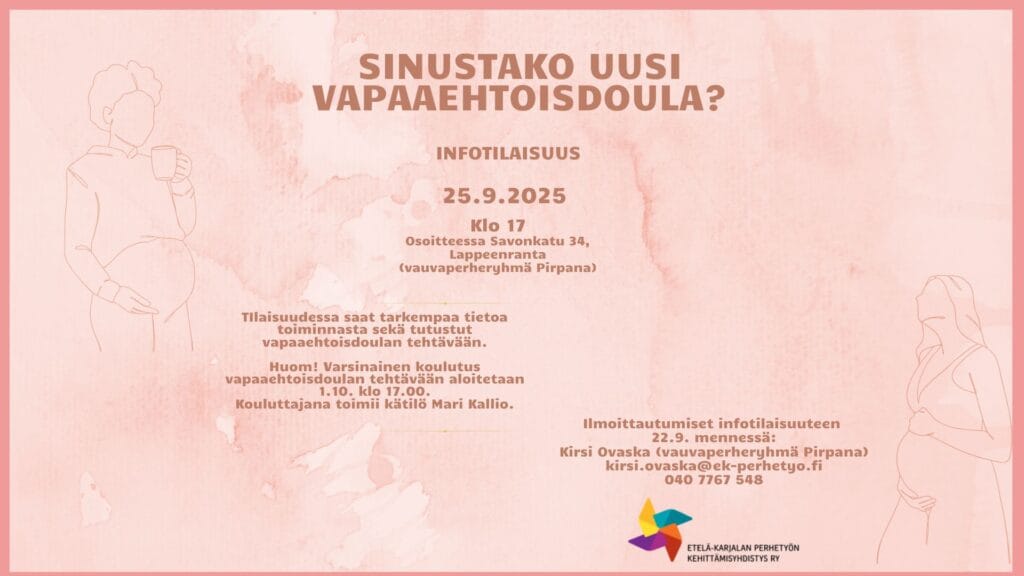 Lämpimästi tervetuloa infotilaisuuteen, jossa saat tarkempaa tietoa vapaaehtoisdoulan tehtävistä. Infotilaisuus järjestetään 25.9. ko 17 vauvaperheryhmä Pirpanan tiloissa osoitteessa Savonkatu 34, Lappeenranta. Ilmoittautumiset infotilaisuuteen 22.9. mennessä.